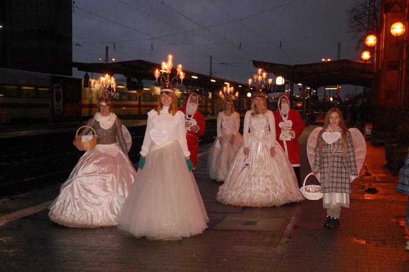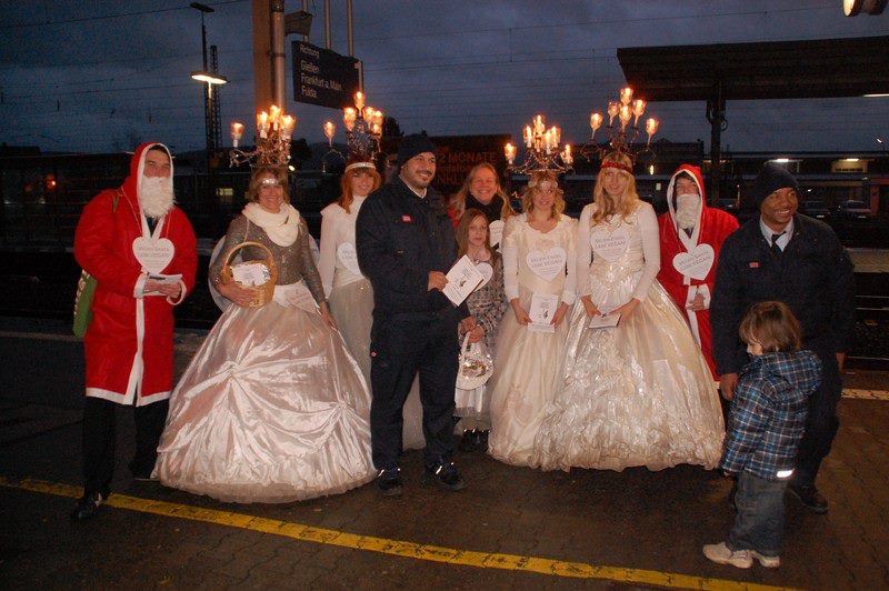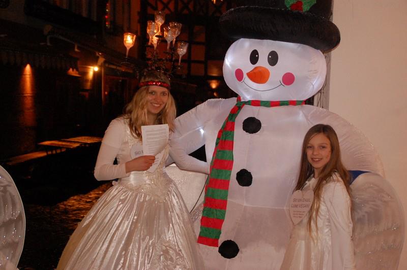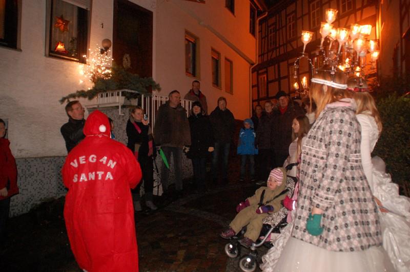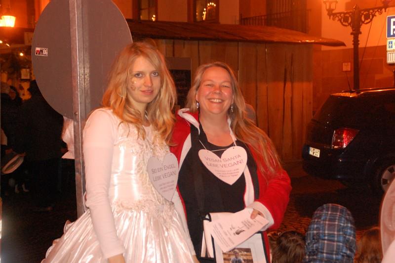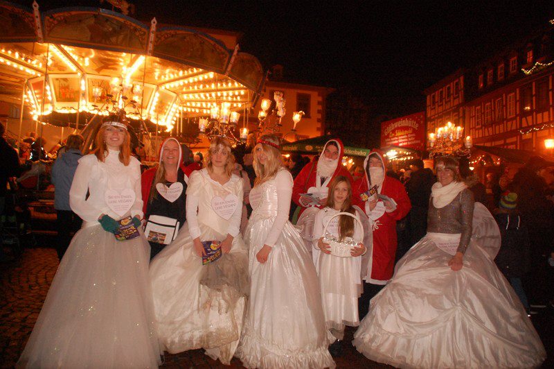 Da staunten die Besucherinnen und Besucher des Gelnhäuser Weihnachtsmarktes nicht schlecht. Unter dem Motto: „Weihnachten – das Fest der Liebe und des Friedens“ setzten einige Vereinsmitglieder des Vereins „Vegan Connection e.V.“ ein Zeichen gegen das Tierleid auf dem Teller. Mit märchenhaften Kostümen, brennenden Kandelabern auf den Köpfen und Informationen machten sie auf die Zusammenhänge mit der Ernährung der Menschen für die Tiere, die Umwelt, die Menschen in den armen Ländern und die Gesundheit aufmerksam. Gesunde Ernährung für alle und nicht nur zu Weihnachten wünschten am Sonntag die zauberhaften, „veganen“ Engel und Weihnachtsmänner bei ihrem Spaziergang über den Gelnhäuser Weihnachtsmarkt und hatten für interessierte Besucherinnen und Besucher auch gleich vegane Weihnachtsrezepte zur Hand.