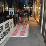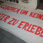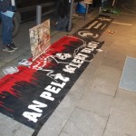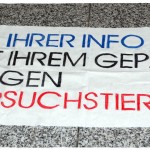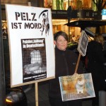 Die Frankfurter Goethestraße zeichnet sich durch die dekadenten Geschäfte der „exklusiven Modemarken“ aus, die jedoch ebenso wie alle anderen Modehäuser gewissenlos ihren Profit aus der Ausbeutung von Mensch und Tier ziehen. Dort mahnten wir die Passant_innen gemeinsam mit weiteren Tierrechtsaktivist_innen mittels Plakaten, Bannern und Informationsmaterial an, ihr Konsumverhalten zu reflektieren und sich mit der Dringlichkeit des Verzichts solch ethisch unvertretbarer Kleidungsstücke zu befassen.