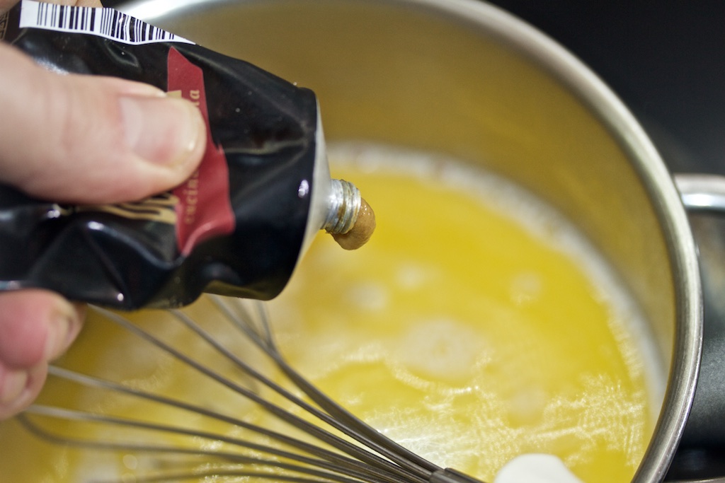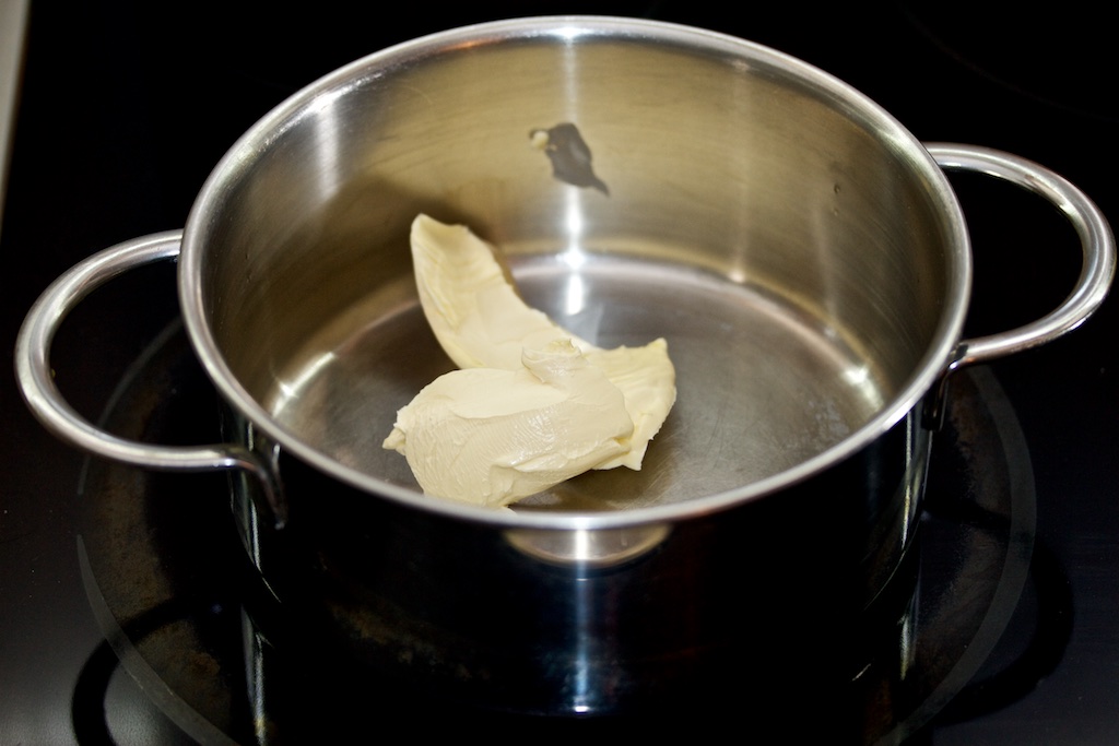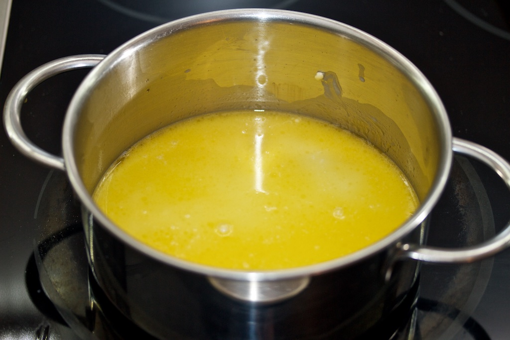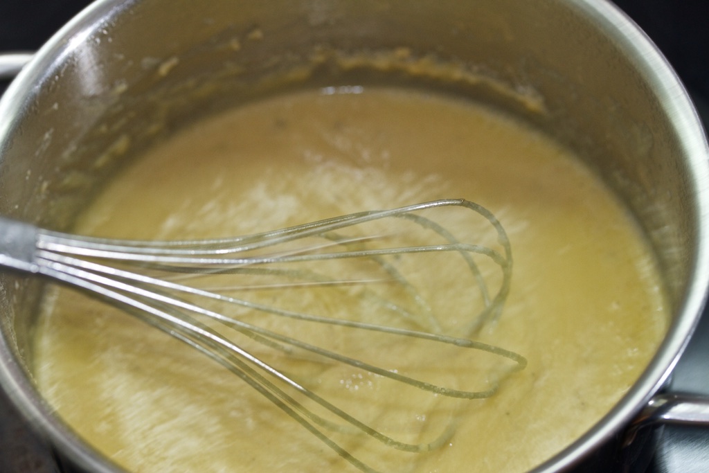 Margarine im Topf schmelzen, dann die Hafermilch und Senf hinzugeben und kurz aufkochen.